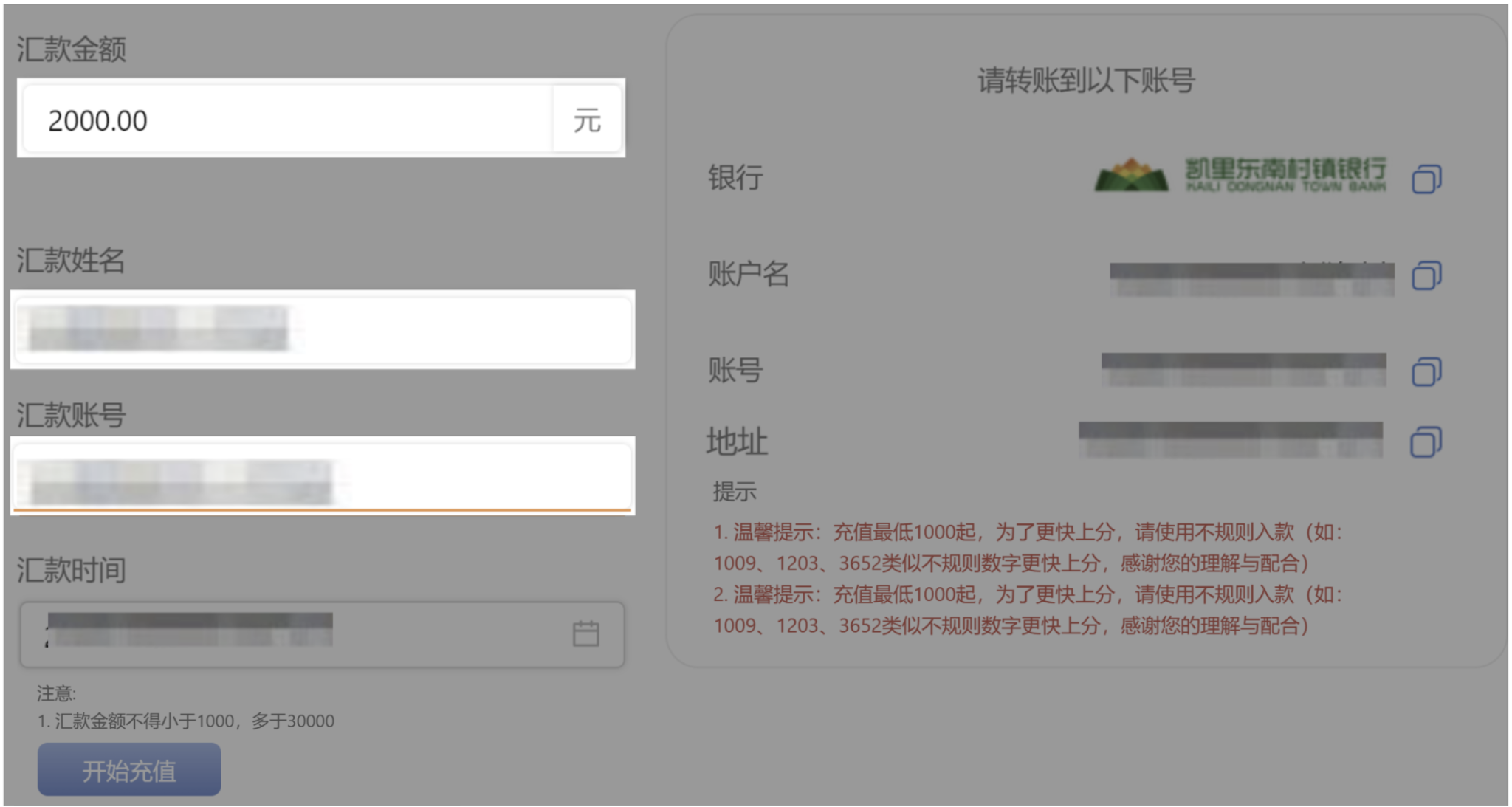 (注意: 实际付款金额务必与提交金额一致,请按照流程付款,并请勿保留旧的充值记录私自或重复转账,否则无法到账)